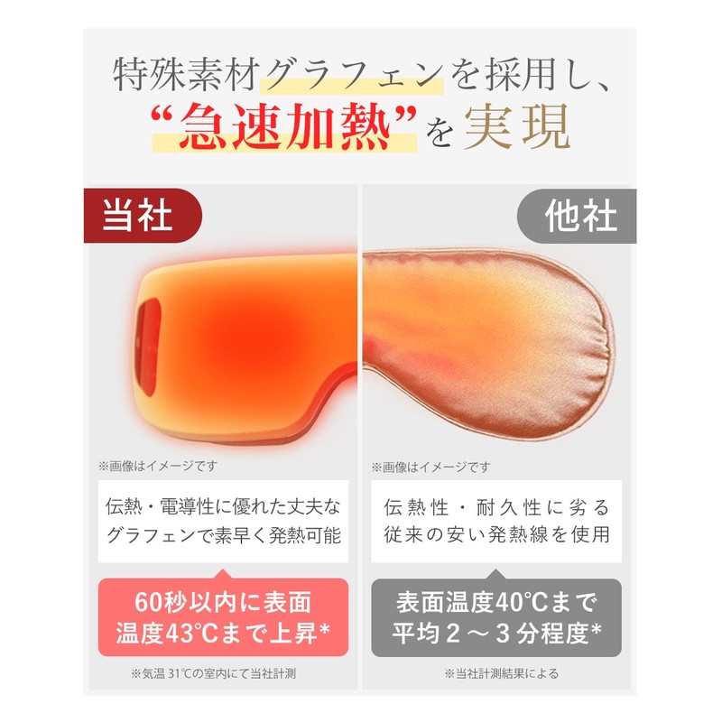 • Heat effect with graphene: When heating up graphene, it emits far-infrared rays of 6 ~ 14 nm.This wavelength infrared heat are easily absorbed by the human body and warm it.This eye warmer is equipped with graphene heating technology that provides stable heat with a top class heat conduction, and after the power is on, it can be used at your preferred temperature according to your mood of the day with rapid heating in 3 seconds, a uniform temperature, and 2-step temperature adjustment