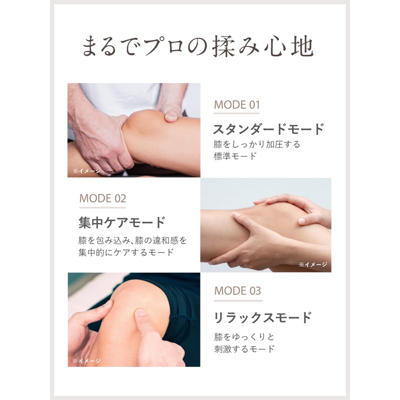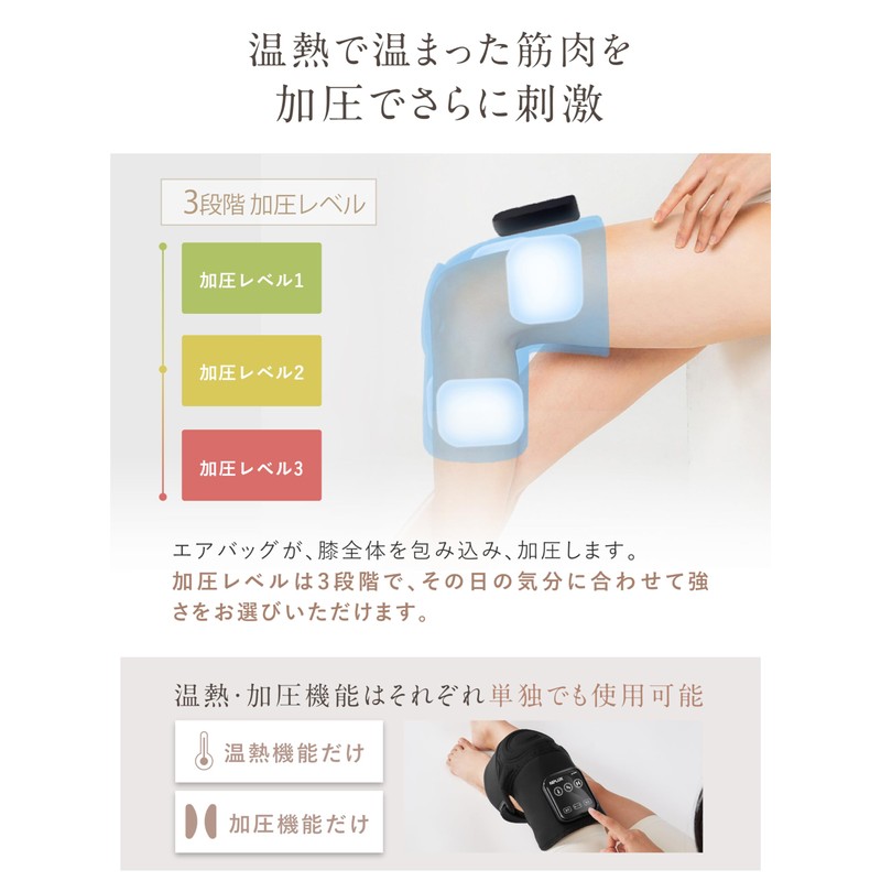 - 【温熱で温まった筋肉を加圧でさらに刺激】エアバッグが膝全体を包み込み、加圧します。加圧レベルは3段階で、その日の気分に合わせて強さをお選びいただけます。