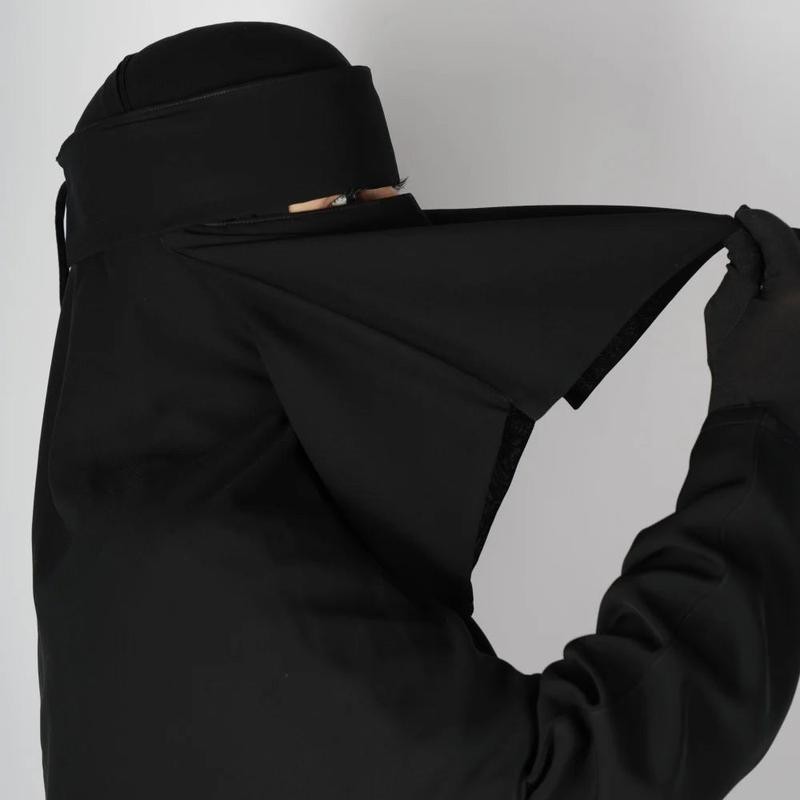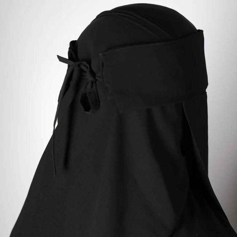 - Food Niqab - Soft HeadbandDesigned with convenience in mind, this niqab includes a soft headband for a secure fit and an open lower section for easy access when eating or drinking.
