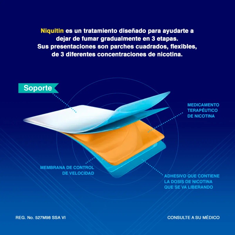 💪 La fuerza de voluntad es importante, pero contar con apoyo hace una gran diferencia. Los parches de NiQuitin se adhieren a tu piel, entregando una dosis controlada de nicotina durante 24 horas. Esto ayuda a aliviar los síntomas de abstinencia como la ansiedad, la irritabilidad y la frustración, permitiéndote mantener la calma y el enfoque mientras te enfrentas al desafío de dejar de fumar.
