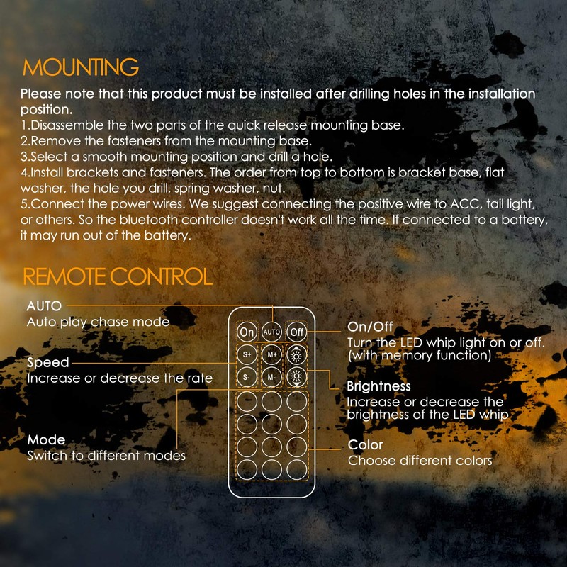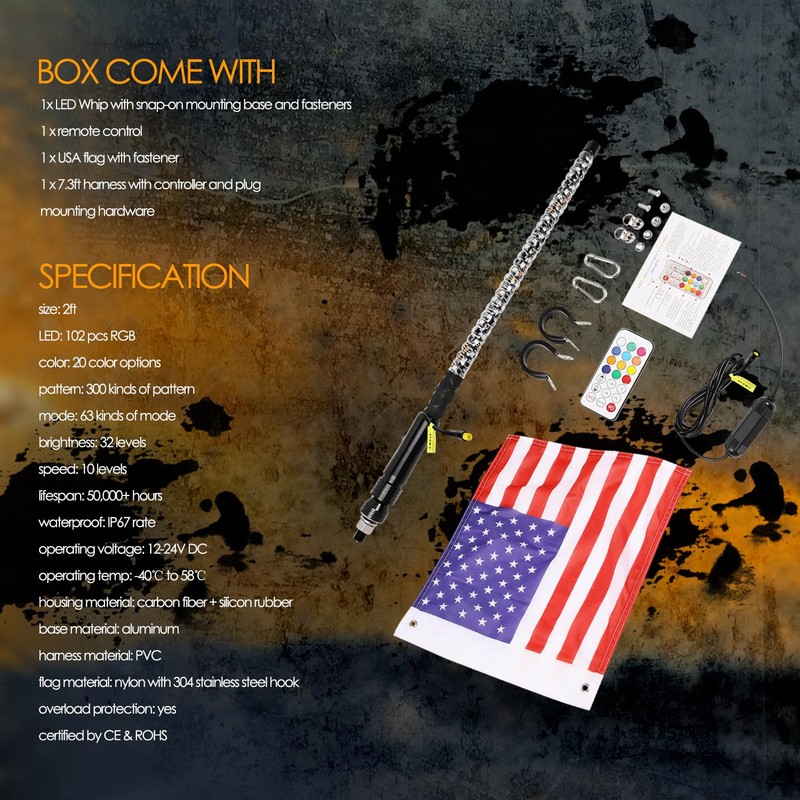 • BOX COME WITH - 2ft LED whips w/7.3ft plug and play harness and control box, remote, quick connect / disconnect mounting base, American flag w/quick release hooks and adjustable grommets, hardware, black whip cap for dustproof, manual. Provide 12 MONTHS quality assurance.