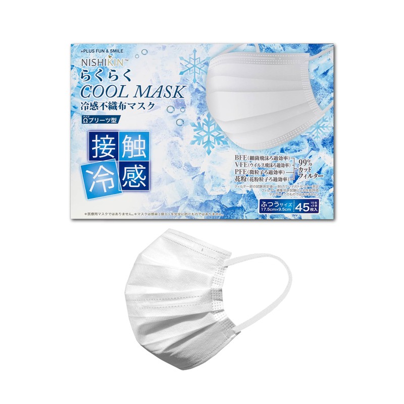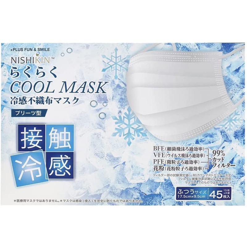 [錦尚金nishikin] 接触冷感 冷感不織布マスク 使い捨て 普通サイズ 45枚×2箱 夏用 スポーツ用 運動用 【トラベル 旅行 旅 アウトドアに クール 涼しい 高機能フィルター BFE99 PFE99 VFE99 花粉99%カット 春用 花粉対策 らくらくクールマスク
