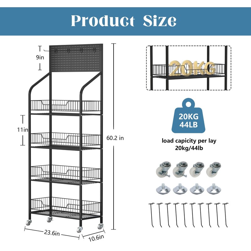 - With Silent Universal Wheels: Our snack display rack is equipped with 4 universal wheels (2 with brakes), 360° rotation, flexible movement, which can help you easily move the supermarket fruit rack to wherever you want