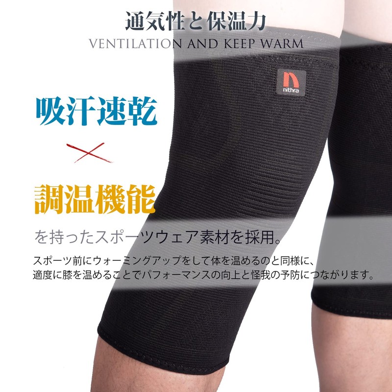 • 吸汗速乾・調温機能を持ったスポーツウェア素材を採用。スポーツ前にウォーミングアップをして体を温めるのと同様に、適度に膝を温めることでパフォーマンスの向上と怪我の予防をします。