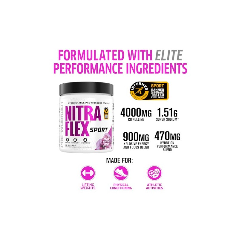 Nitraflex Sport - Polvo de pre-entrenamiento, libre de sustancias prohibidas, certificado Informed Choice, 20 porciones (10.9 Oz, Grape Cotton Candy)