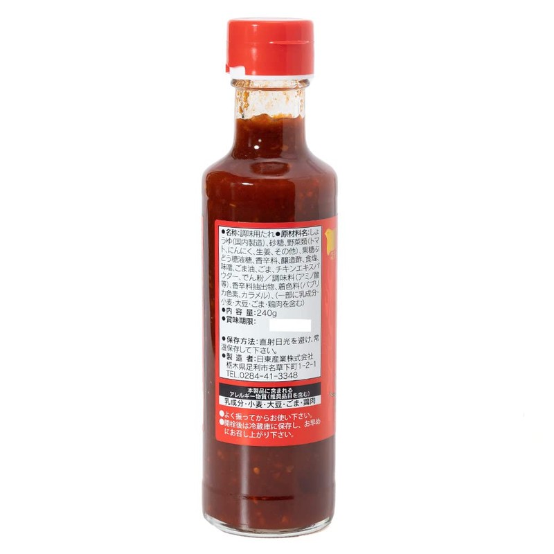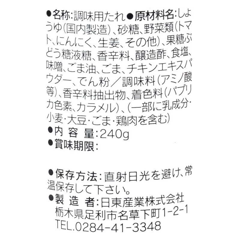 • Ingredients: Soy sauce, sugar, high-fructose corn syrup, vegetables/fruits (tomatoes, garlic, ginger, etc.), spices, brewed vinegar, salt, miso, sesame oil, bouillon, sesame, starch, seasoning (amino acids, etc.), spice extract, paprika pigment, caramel coloring, (some ingredients may contain wheat, milk, soy, sesame and chicken. )