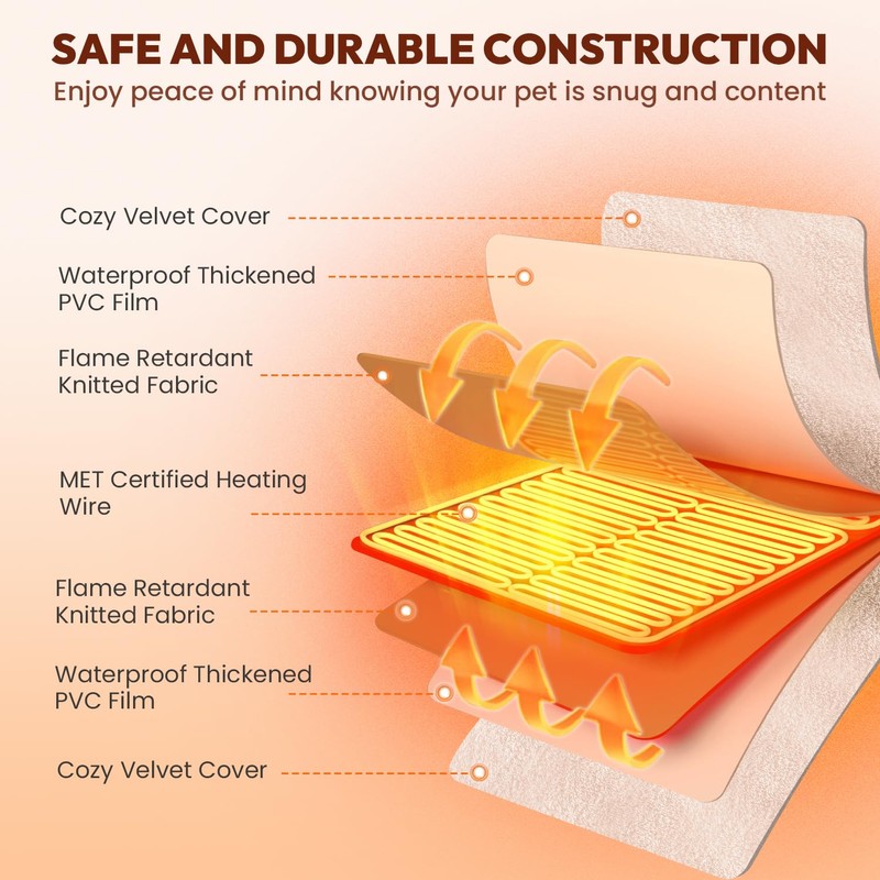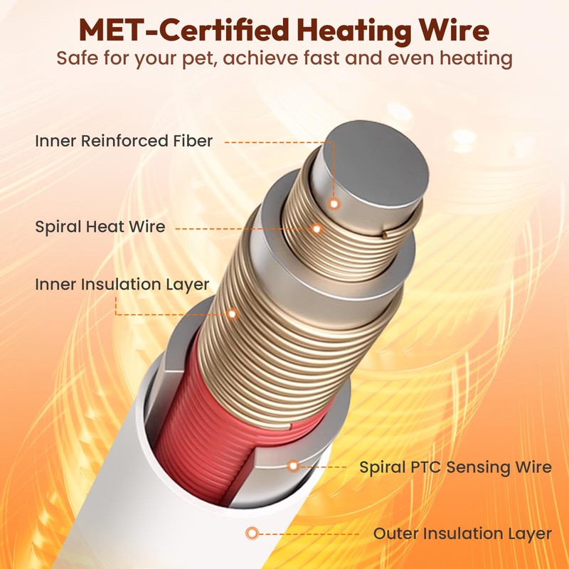 - Safe and Reliabl: The electric heating pad for cats and dogs has a 7-layer protective structure with MET-certified heating wire, that protects your pets from burns. Chew resistant cord is made of fully surrounding bendable stainless steel and clad anti-bite hose. It also designed with a durable ABS fixed clamp, which is resistant to chewing and tensile.