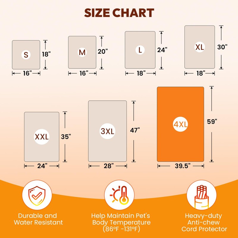 - Adjustable Temperature: Equipped with a 6-level adjustable temperature controller, allowing you to choose the appropriate temperature setting based on your pet's needs and the surrounding environment. The range is between 86℉ to 131℉, ensuring optimal comfort for your pet whether it's during cold winter days or cool nights.