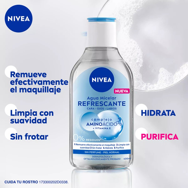 Disfruta de una limpieza e hidratación profunda que cuida tu piel con el Agua Micelar Desmaquillante sin Perfume de NIVEA. Este producto elimina el maquillaje eficazmente sin dejar una sensación grasosa en la piel. Su fórmula vegana purifica sin secar, limpiando, suavizando y refrescando tu rostro.