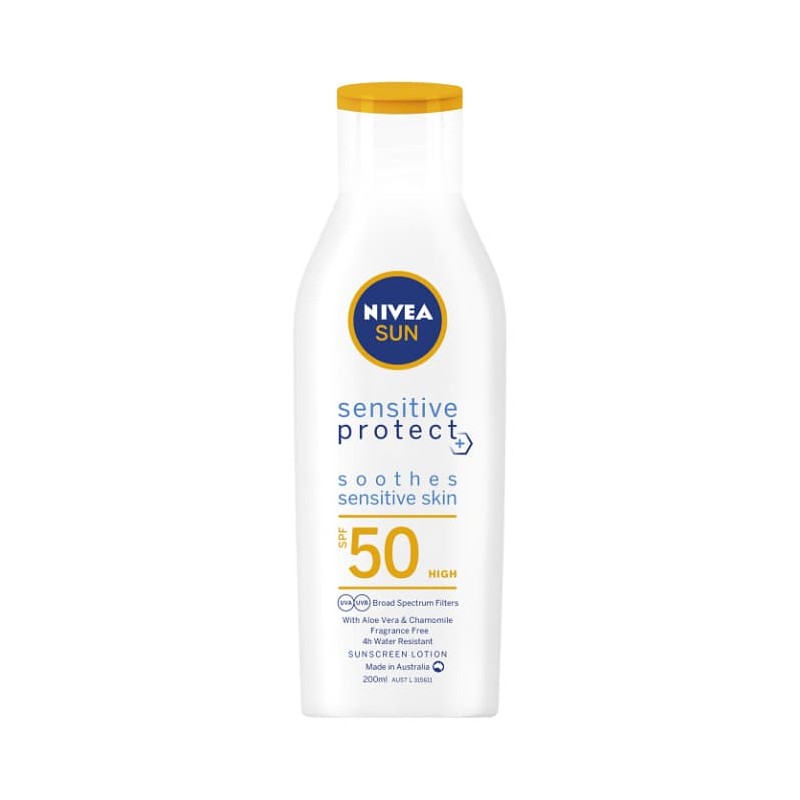 NIVEA SUN Sensitive Protect Sunscreen Lotion SPF50 cares for your skin in more ways than one, combining broad spectrum sun protection whilst being suitable for sensitive skin. Highly effective UVA and UVB filters shield skin from sun damage. The non-greasy formula helps to soothe and calm reactive skin, made with quality ingredients such as Aloe Vera and Chamomile. Plus, the fragrance free formula with moisturising Vitamin E helps protect and repair the skin by keeping it hydrated resulting in it being less vulnerable to sun damage. The skin compatibility of this sunscreen has been dermatologically tested and approved. Made in Australia.
