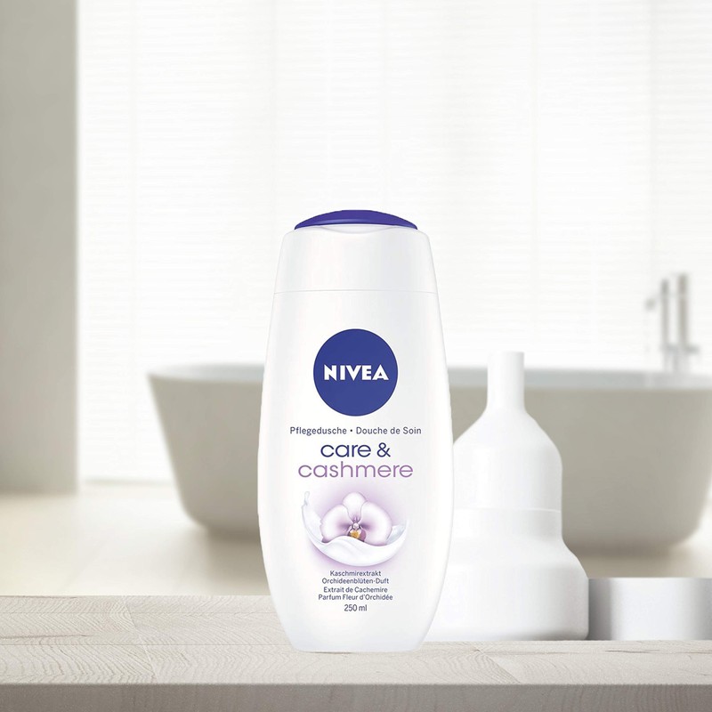 - Practical Package: Nivea Creme Care & Cashmere Shower in 250 ml bottle. Formula free from solid microplastic particles in accordance with UNEP definition, item number 81060.