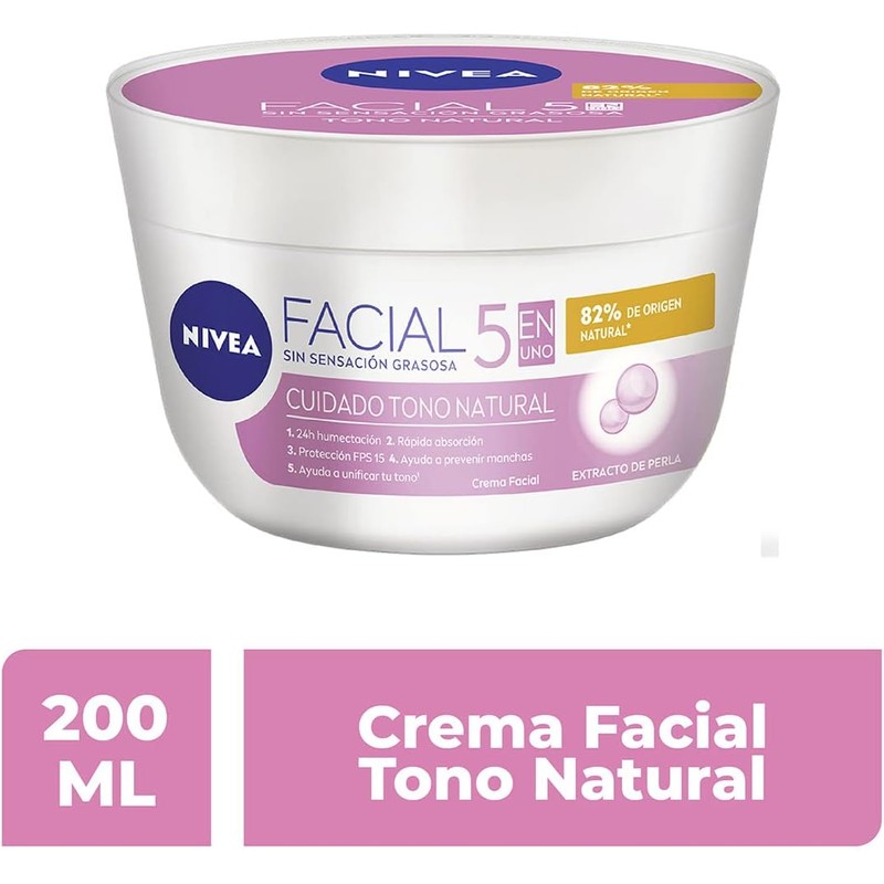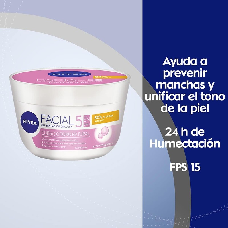Complementa tu rutina de cuidado facial con nuestra crema facial hidratante 5 en 1 Aclarado Natural de NIVEA. Su innovadora fórmula contiene Hidro nutrientes que al entrar en contacto con la piel del rostro se funden llegando hasta la capa más profunda proporcionando una hidratación intensiva, sin dejar residuos grasosos en la superficie. Aclarara las manchas de la piel gracias a su ingrediente activo de extracto de perla, rápida absorción y textura ligera al mismo tiempo que protege tu piel de los rayos del sol gracias a su protección solar FPS15.