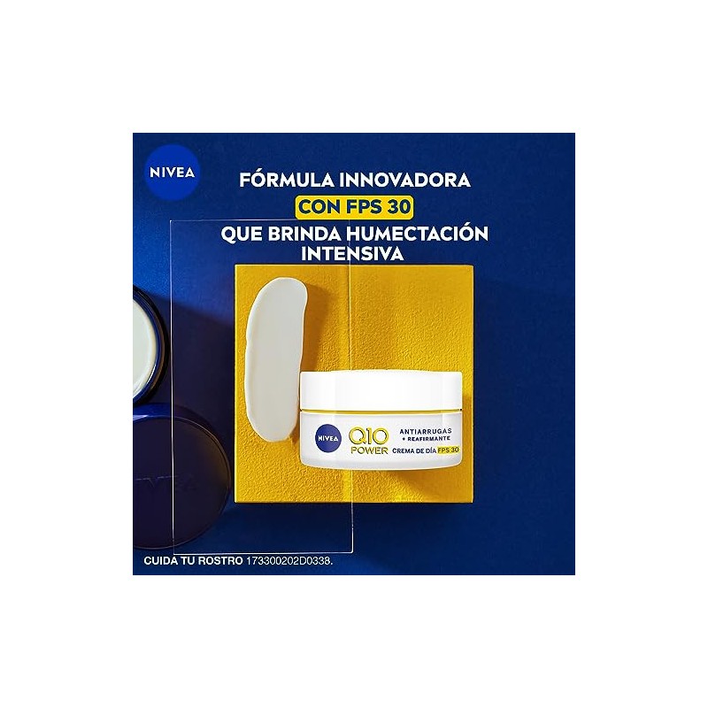 Tu piel más firme y lisa en tan solo dos semanas con la crema facial reafirmante Q10 de NIVEA La piel es el órgano más grande de nuestro cuerpo. La vitamina Q10 y Creatinina son poderosos activos que se encuentran en la piel joven. Con el paso de los años, sus niveles decrecen, generando que la piel tenga menos energía para regenerarse. Con el tiempo la piel es más propensa a arrugarse y a que aparezcan signos de la edad. Nuestra Crema facial humectante Antiarrugas + Reafirmante Q10 de NIVEA funciona efectivamente en las arrugas desde adentro, reduce su apariencia y ayuda a prevenir nuevas. Su fórmula ligera, de rápida absorción ayuda a la generación de Colágeno en la piel ayudándola a combatir el proceso de envejecimiento. Hace más de 130 años, inventamos el cuidado de la piel moderna con NIVEA Creme. El día de hoy, millones personas alrededor del mundo de todo tipo de piel, confían en la marca de NIVEA. Nuestros investigadores trabajan extensivamente con diferentes tipos de piel – sensibles a diferentes métodos que se requieran dependiendo de la cultura, edad y género. Funciones y beneficios Nuestra crema facial anti edad brinda corrección visible de arrugas. La crema facial anti edad ayuda a reducir arrugas superficiales, arrugas de la frente y patas de gallo. Protege contra los rayos UVB y UVA que causan foto envejecimiento gracias a su protección solar FPS 30. Compatibilidad con la piel dermatológicamente probada.