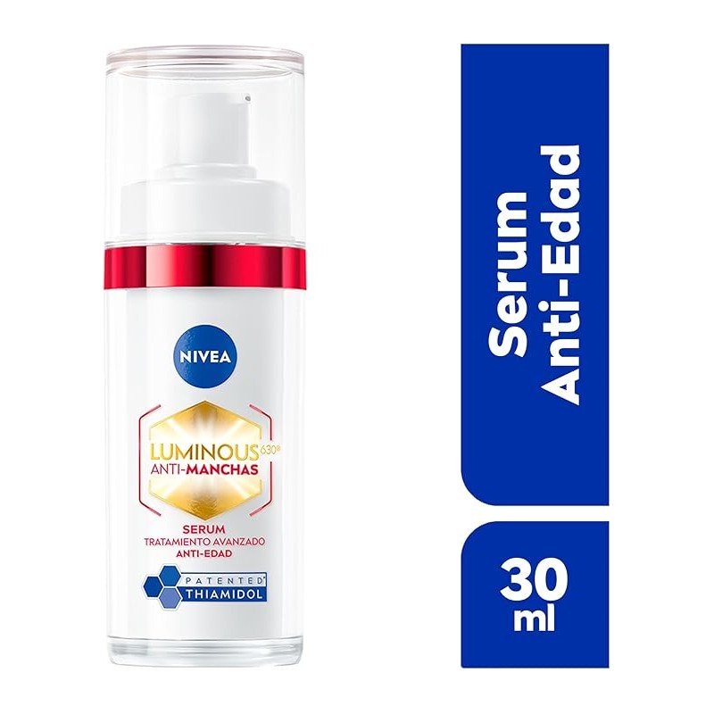 Vive la revolución anti manchas con el serum facial anti-manchas NIVEA Luminous 630 Serum Facial Anti-Manchas Anti-Edad. Complementa tu rutina de skincare con el serum aclarador de manchas de textura ligera, de rápida absorción, que tiene la mayor eficacia en el tratamiento de manchas gracias a su triple acción: 1. Reduce manchas por edad. 2. Densifica la piel gracias al colágeno en su fórmula. 3. Rellena las arrugas profundas gracias a su fórmula con ácido hialurónico. El altamente efectivo LUMINOUS 630 actúa a nivel superficial celular, equilibrando la producción de melanina para ayudar a prevenir la aparición de nuevas manchas y unificar el tono natural de la piel, aumentando su luminosidad. Su fórmula ligera es suave con tu rostro y es recomendado para todo tipo de piel. Ayuda a reducir 10 años de manchas de la edad acumulada primeros resultados visibles en 4 semanas. Fortalece, reafirma y densifica la piel. MODO DE USO: Aplica el serum aclarador de manchas diariamente sobre el rostro limpio, por la mañana y por la noche antes de tu rutina facial, extendiendo el serum facial aclarador de manchas por toda la cara. Complementar por la mañana con LUMINOUS630® fluido anti manchas facial de día FPS 50 para ayudar a evitar la reaparición de manchas. Usar la crema aclaradora de manchas un máximo de 4 veces al día. RESULTADOS: LUMINOUS630® ayuda a reducir y aclarar las manchas más oscuras y previene la formación de otras nuevas. Ayuda a rellenar las arrugas profundas a partir de 7 días de uso regular. Para una piel luminosa, uniforme y fortalecida, de aspecto más joven. Aumenta la producción de colágeno propio de la piel lo que ayuda a rellenar las arrugas más profundas. Activa la pigmentación existente para aclarar las manchas y reducir su tamaño. Equilibra la producción de nueva melanina para prevenir la aparición de nuevas manchas. Ideal para todo tipo de piel, incluso piel sensible.