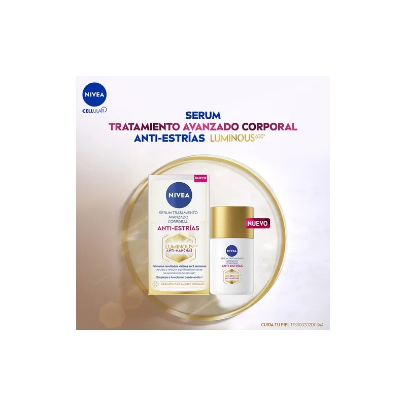 ✨ ¡Transforma tu piel con el NIVEA Luminous630 Serum Aceite Corporal Anti-estrías de 100ml! 💖 Reduce visiblemente estrías en 2 semanas y previene nuevas. Fórmula patentada con Luminous 630 para tono uniforme y 48h de hidratación.