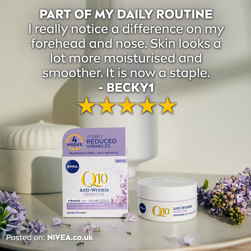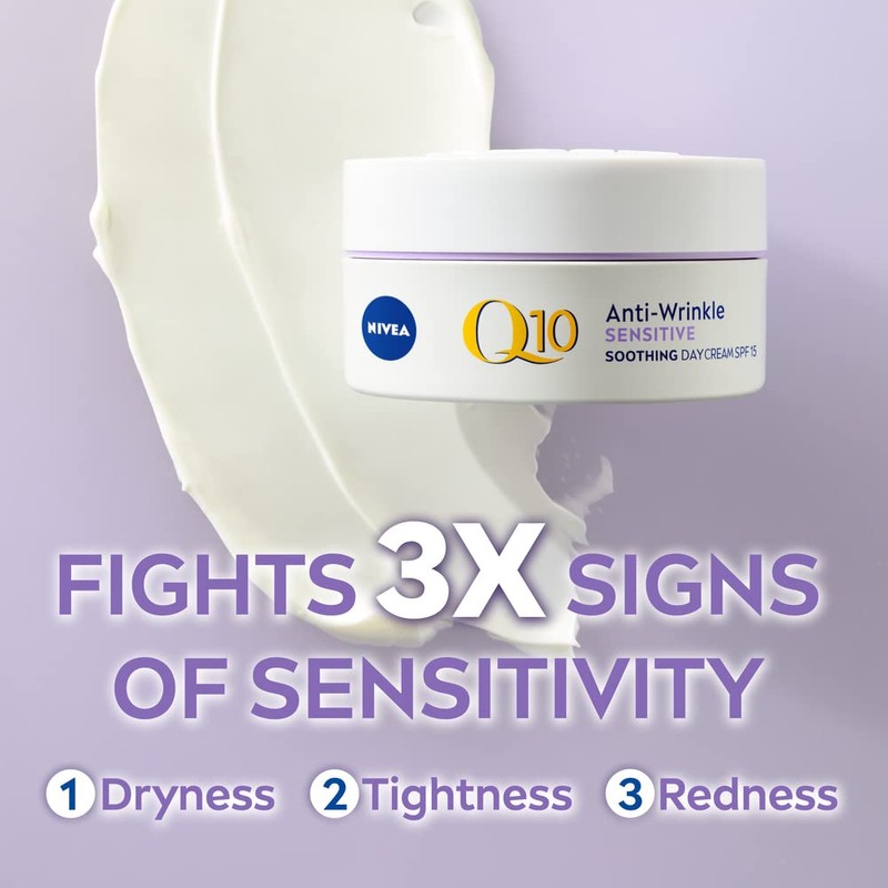 NIVEA Q10 Anti-Wrinkle Sensitive Firming Day Cream SPF 15 (50ml), Anti-Wrinkle Face Cream with Skin Identical Pure Q10 and Liquorice Extract, Sensitive skin face cream