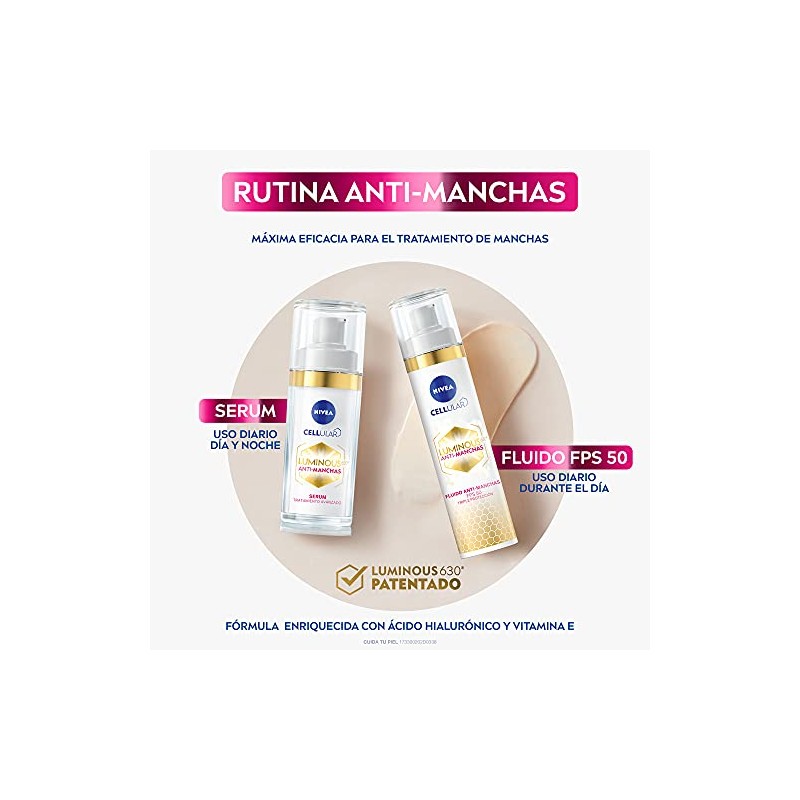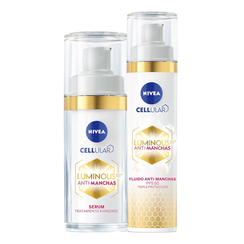 NIVEA Rutina Anti-manchas Rutina Facial Completa Luminous 630 (2 piezas), Enriquecida con Ácido Hialurónico Serum facial 30 ml + Fluido facial FPS50 con Vitamina E 40ml