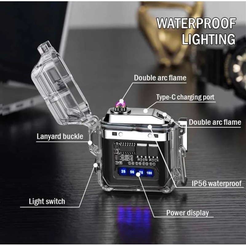 FEATURES Waterproof Type-C Rechargeable dual arc electric lighter. 3 modes of flashlight.