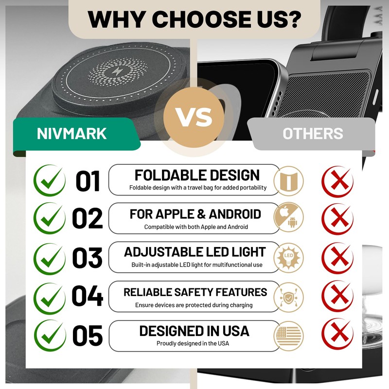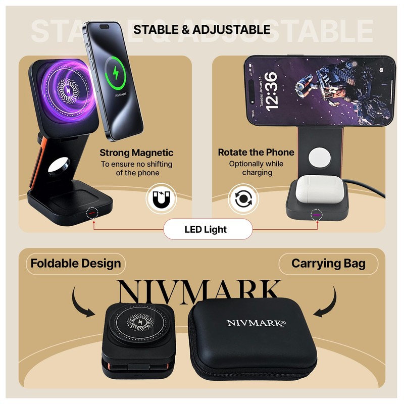 Nivmark Foldable Wireless 3-in-1 Charging Station with Travel Bag for Multiple Devices C Fast Charging Station Dock with LED Light, for smatphones, Watches & Earbuds
