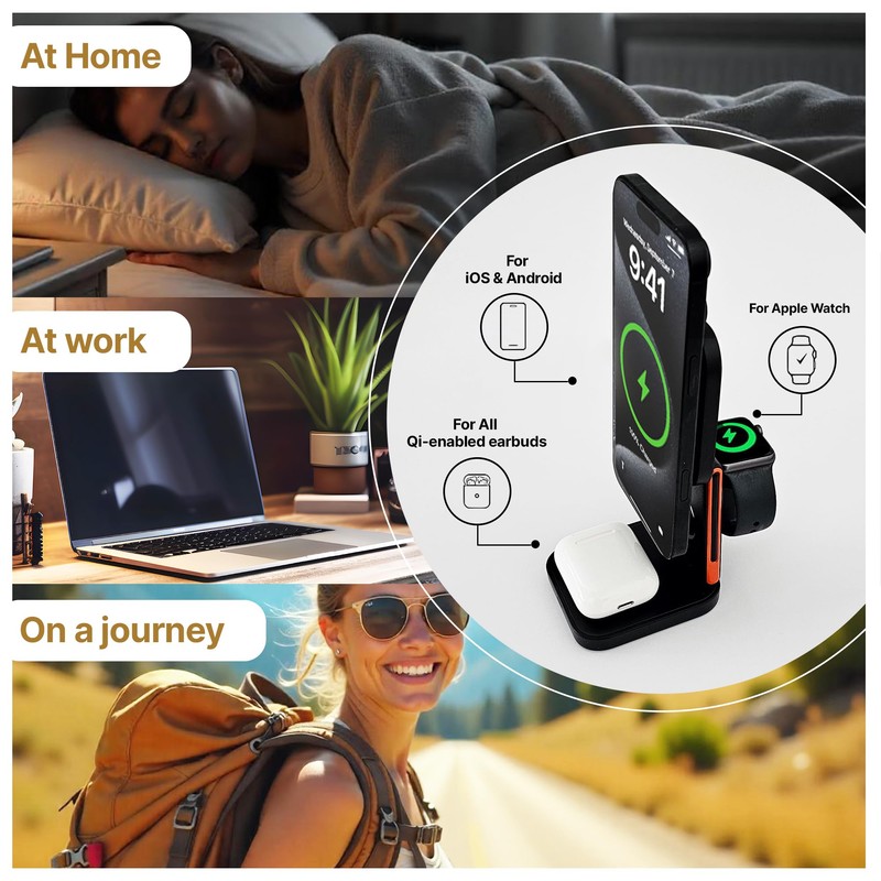 - WHAT YOU'LL GET: In the package, there are a 3-in-1 charging station, a USB-C cable, a magnetic ring a travel bag. This compact easy to use set is perfect for those seeking efficiency and convenience in their charging needs.