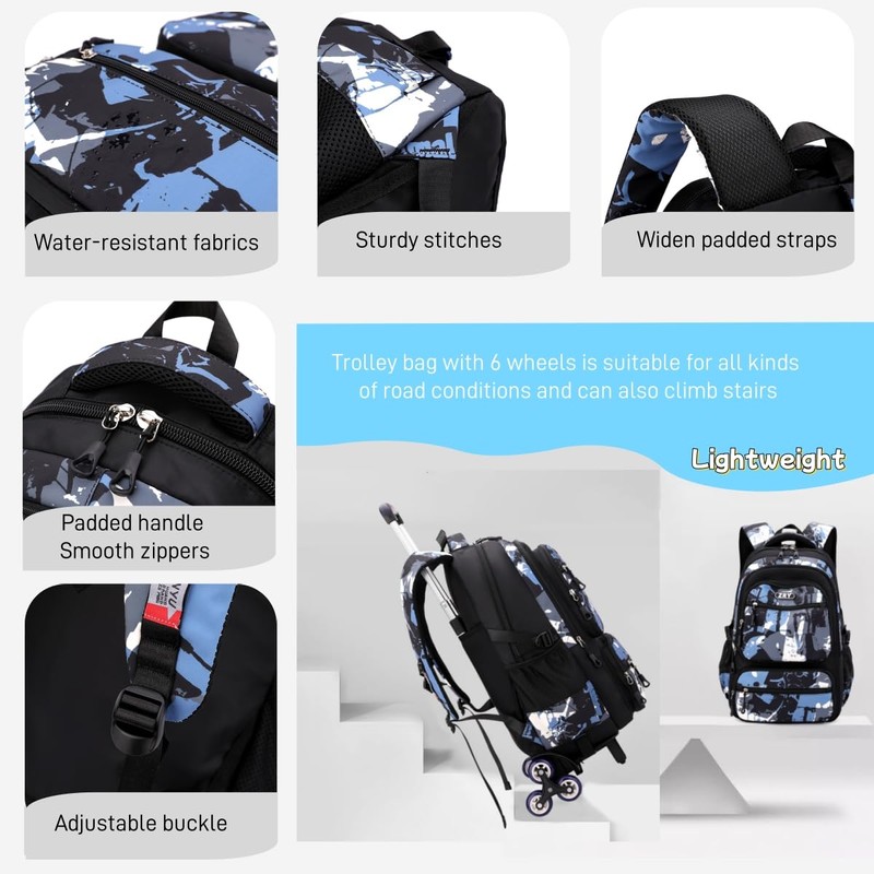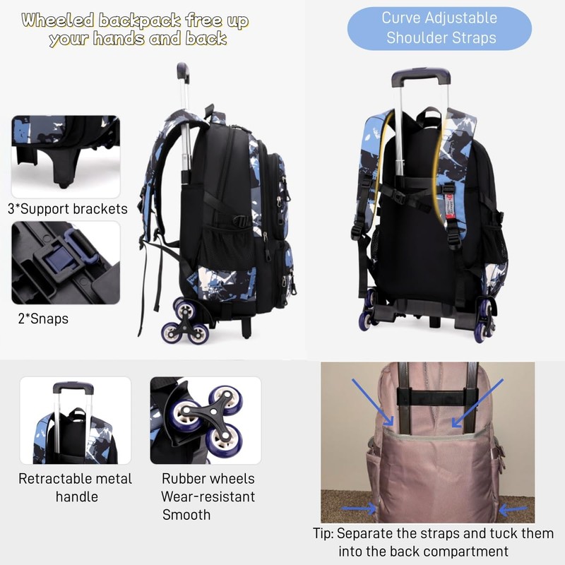 - Removable Backpack with Wheels for Boys: After assembling the backpack and trolley, the backpack can stay on the trolley stably without rollover, whether on flat ground or up stairs; wear-resistant rubber 6 wheels, reinforced aluminum alloy double handle, telescopic design can save space; you could use the backpack with the trolley or trolley can be separated use if desired