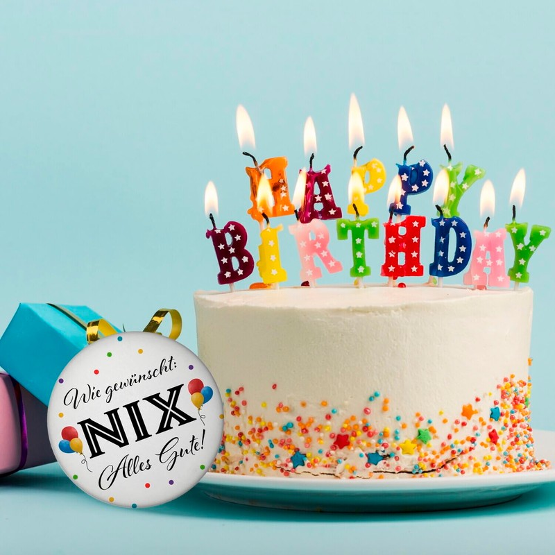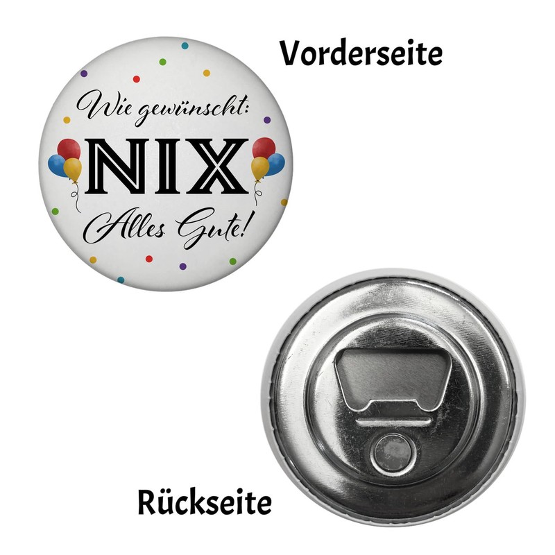 • Box contents: 1 x NIX desired magnet with bottle opener round with saying "Alles Gute (Alles Gute