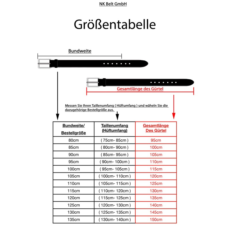 Item description: elegant and simple: the 43 mm wide buffalo leather belt makes a great look on your trousers and completes your outfit. The belt sits quite firmly, which makes the belt not easy to slip off the hips. Die Doppeldorn Schlle ist sehr einfach zu handhaben und stellt keine Probleme da. It protects the leather thanks to its rounded edges and smooth surfaces. Quality: The leather strap is made from 100% buffalo leather, which is made in Germany from one piece of high-quality leather, making the leather very stable and robust. The belt is 43 mm wide and has a thickness of approx. 3.5 mm. Dimensions: the length selected above includes the waist and the total length of the belt, the left value always refers to the waist size and the right value to the total length. The waist size corresponds to your waist circumference / hip circumference. To get the complete total length of the belt, you must add to the waist size 15 cm. If you are unsure about your size, you can also choose a longer belt and then shorten it. We are convinced of the quality of our products. If you are not satisfied with it, please contact us. We are happy to help you and offer you either a free exchange, or a money back. Satisfaction: Our belts are manufactured with the highest care and precision and undergo strict quality controls, if there are still problems or questions, you can contact us at any time via the correction function, we will be there for you, as your satisfaction is very important to us. Branded product of NK Belt GmbH 100% buffalo leather. Info: small defects and bumps characterise real leather.