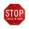 NMC National Marker SS4R NMC Warning Sign, Stop, Check in HERE”, 12” Height x 12” Width, Rigid Plastic, White on Red