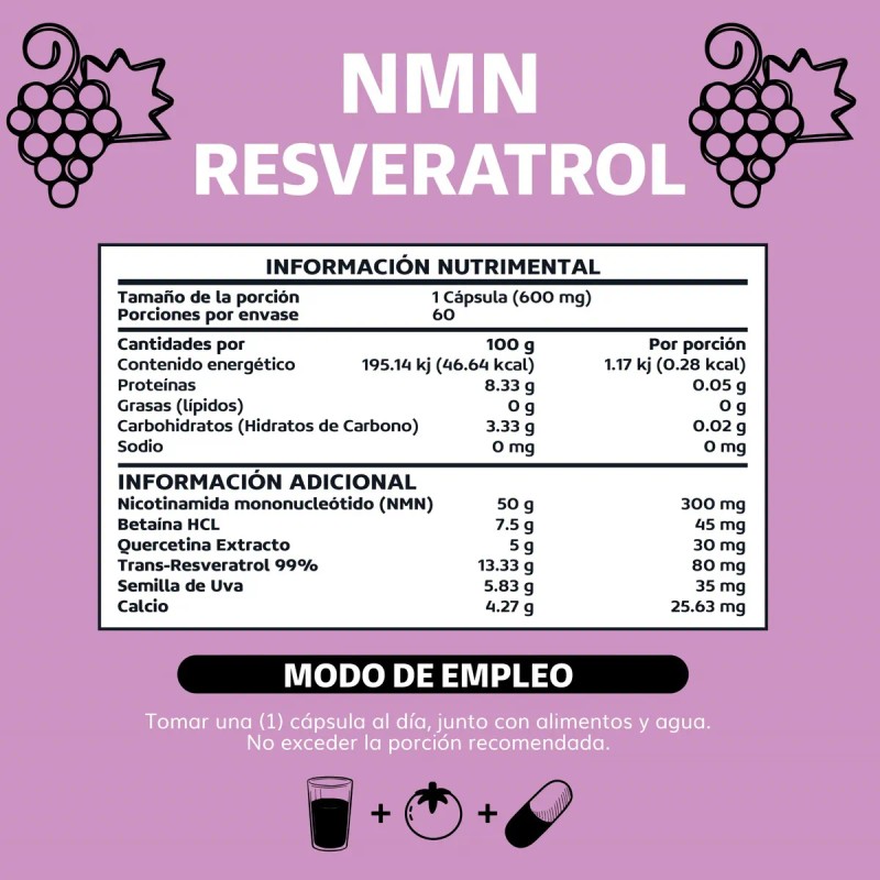 Nmn + Resveratrol Capsulas 99% + Betaína Hcl + Quercetina Extracto | Beyond Vitamins | Mononucleotido De Nicotinamida, Nad + | Semilla De Uva, Calcio - Vitaminas Mujer / Hombre - 60 Cáps