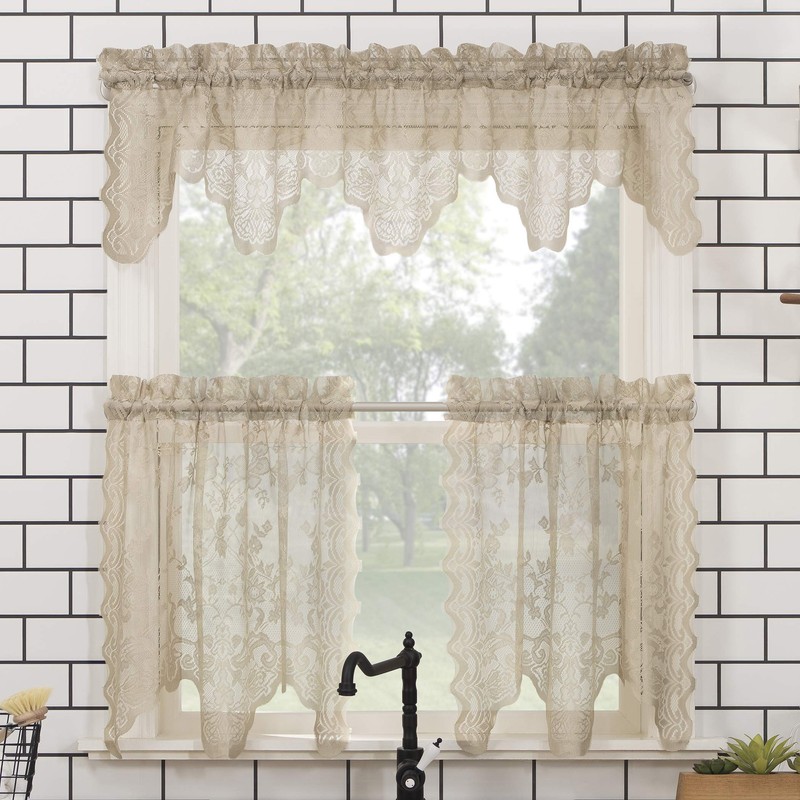 No. 918 Alison-Tr Floral Lace Sheer Rod Pocket Kitchen Curtain Tier Pair, 58" x 36", Stone