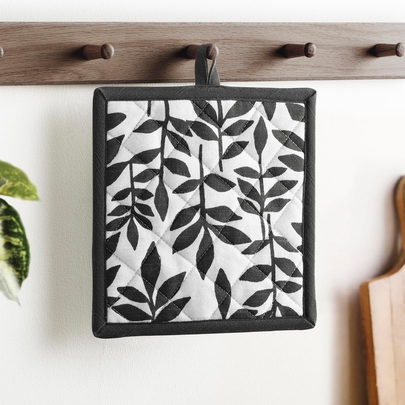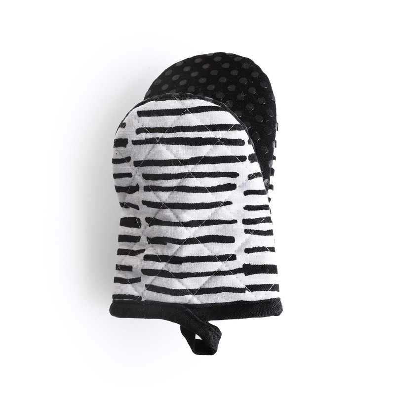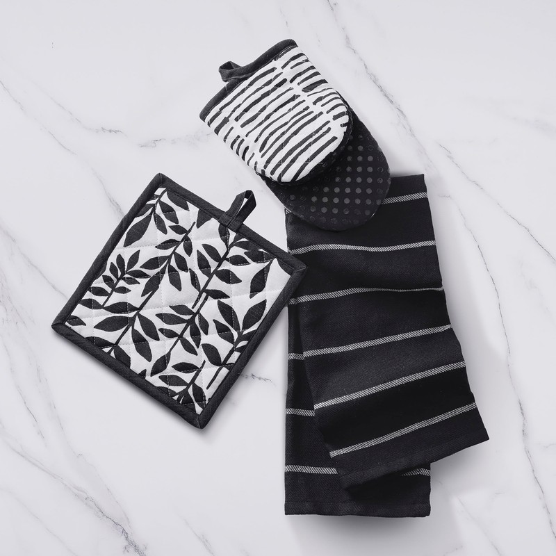 - Set includes 1 abstract stripe mini oven mitt, 1 botanical print potholder, and 1 pinstripe kitchen towel