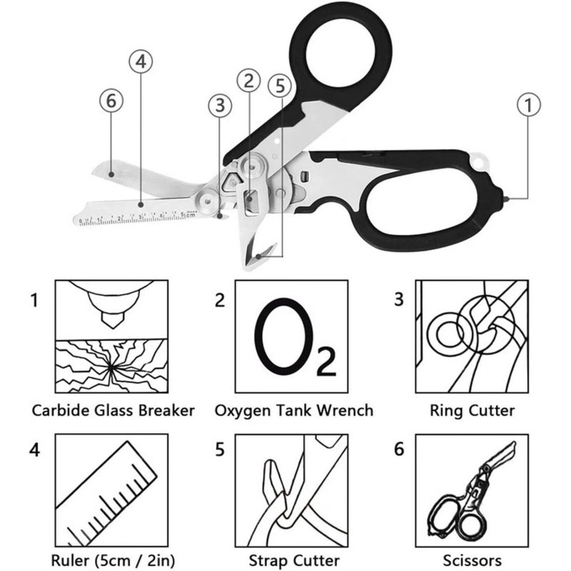 - There are 6 basic functions, which can be used as folding wound shears, belt shears, ring shears, rulers, oxygen tank wrenches, and carbide glass crushers. An essential tool for outdoor emergency situations