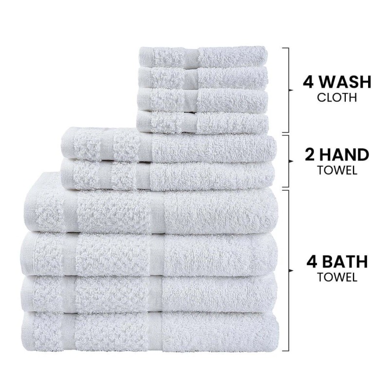 - 10-piece set includes 4 bath towels, 2 hand towels, and 4 washcloths
