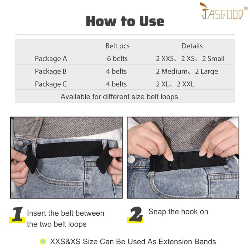 ✪Premium Material:The no buckle belt is made of high-quality elastic strap+sturdy metal hook-and-loop.It's very durable,invisible and tight enough to hold your pants up very well.At the same time will not dig into your stomach,give you more freedom.It can also support light weight items hanging on the belt.- ✪Multi-strip Combination Pack:Different pants have different loop spacing,multipack can easily solve this problem.Package A contains 2 XXS, 2 XS, and 2 Small;package B contains 2 medium and 2 larges;package C contains 2 XL and 2 L.XXS&XS size can be used as extension bands.Please measure the distance between the two belt loops of the pants and choose the appropriate size package before purchasing.