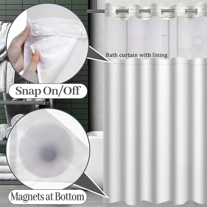 - Removable Liner and See Through Top: This shower curtain and liner set with snap in liner is easy to replace and clean. The top of the spring shower curtain has sheer window that allows natural light in and ventilation, allowing you to see outside while maintaining privacy.
