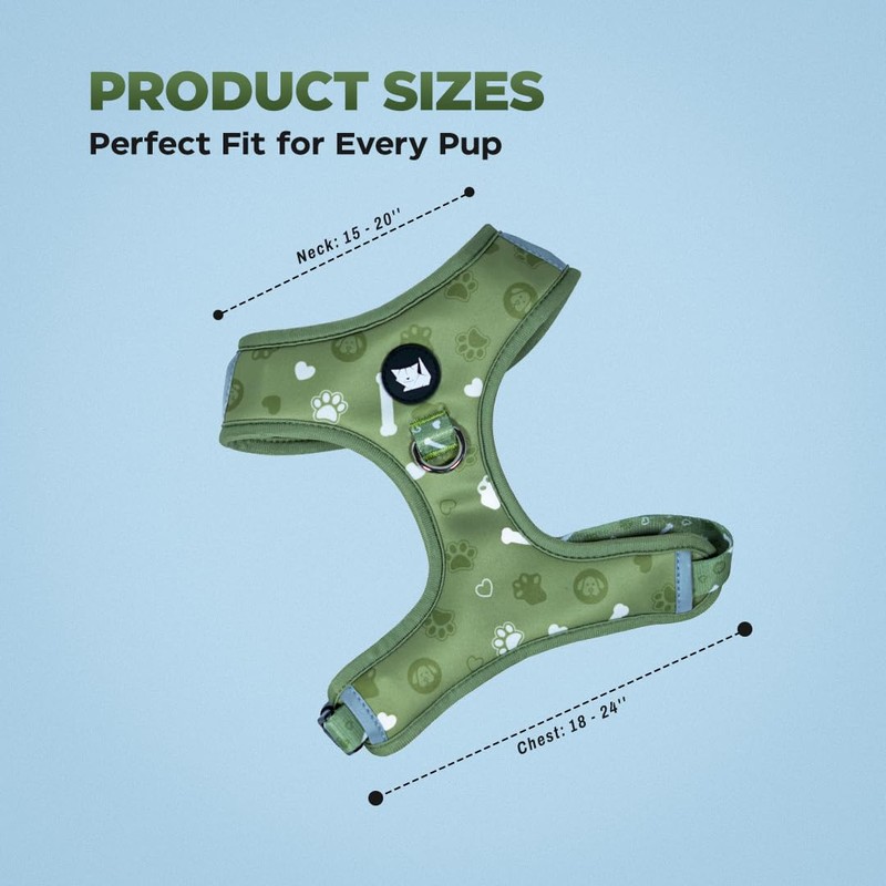 - Reflective & Playful: A stylish reflective dog harness designed to increase visibility during early morning or nighttime walks. Finished with fun paw, heart, and bone prints in soft, neutral tones