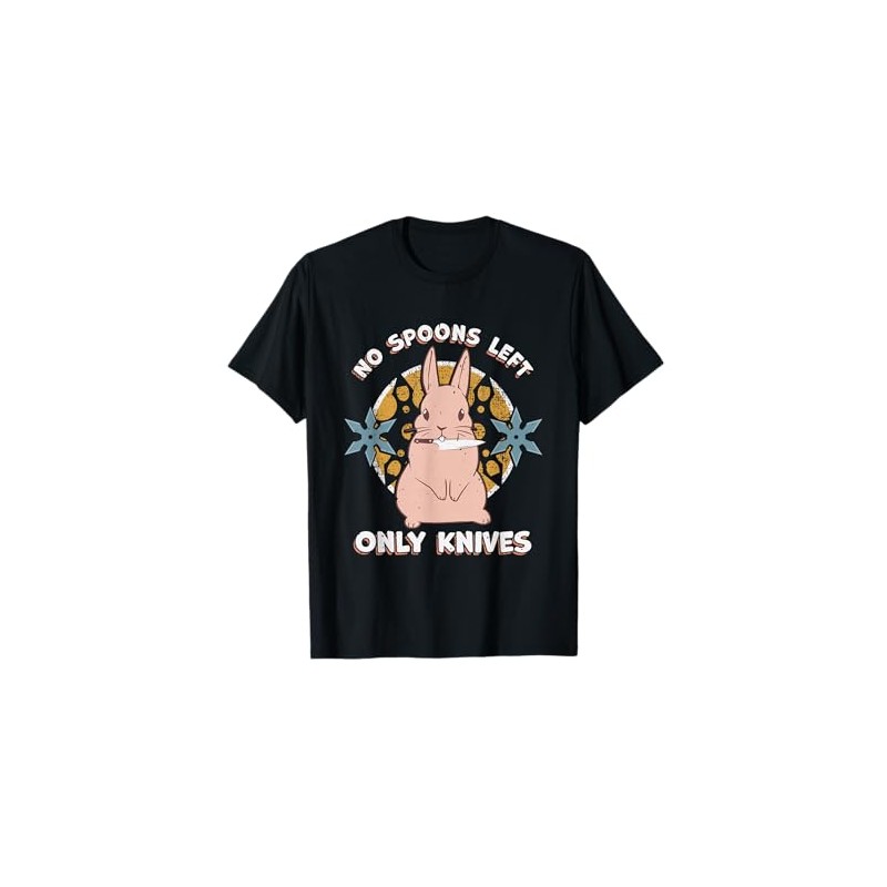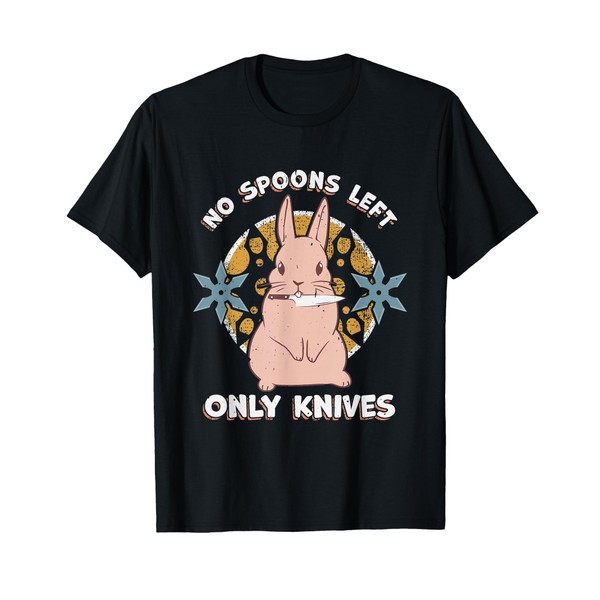 • This creepy cute spoonie design says "No Spoons Left Only Knives" in chalk lettering around an illustration of a rabbit bunny holding a knife in its mouth. Muted earth tones for boho hippie vibes.