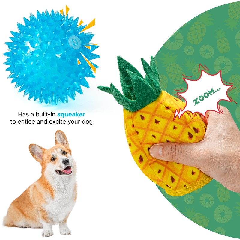 - TRP Rubber Ball Inside for Extra Fun:Each pineapple toy contains a rubber prickly ball that squeaks with every bite. This engaging feature captures your dog’s attention, fulfilling their chewing instincts while offering a delightful sound that adds to the excitement. Perfect for keeping your dog entertained and mentally stimulated, it encourages them to play, chew, and enjoy hours of fun.