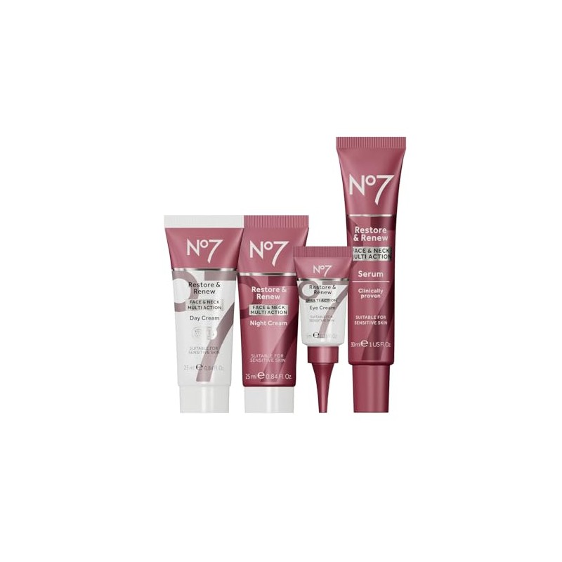- This 4-piece gift set includes No7's best-selling Restore & Renew Day Cream, Night Cream, Serum, and Eye Cream for a complete restoration regimen. This gift set contains: