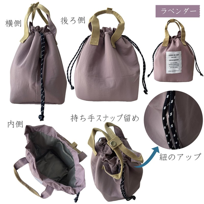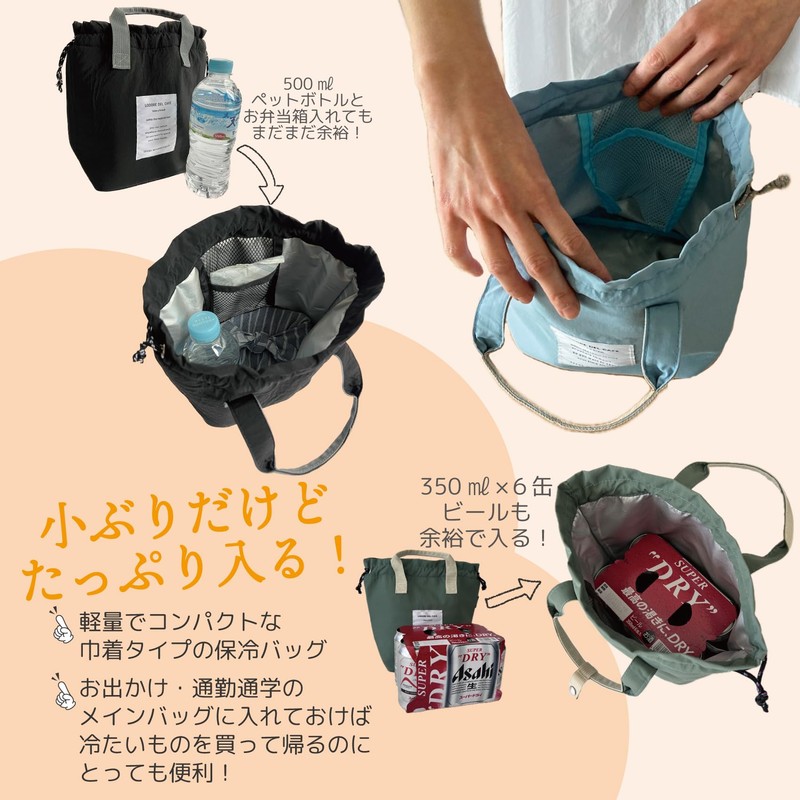 - A convenient lunch bag that keeps you cold, warm, and lightweight The interior has a mesh pocket (1 pocket), so it is convenient for storing ice packs. The opening is wide and easy to use drawstring type. The bottom is wide and sturdy and stands up on its own. The gusset is firm so it is small, but it can fit more than it appears. Holds 6 cans of 350 oz (350 g)