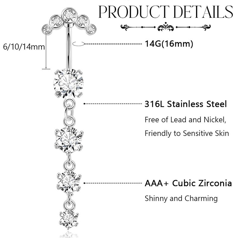 - EXCELLENT WORKMANSHIP: Long belly button piercing is well made and the unique design is both beautiful and practical. Different draping styles meet your diverse desires for shape. Hypoallergenic materials, non-fading, comfortable size and versatile design - from materials to workmanship - all-round high-quality belly button piercing for a fashionable look