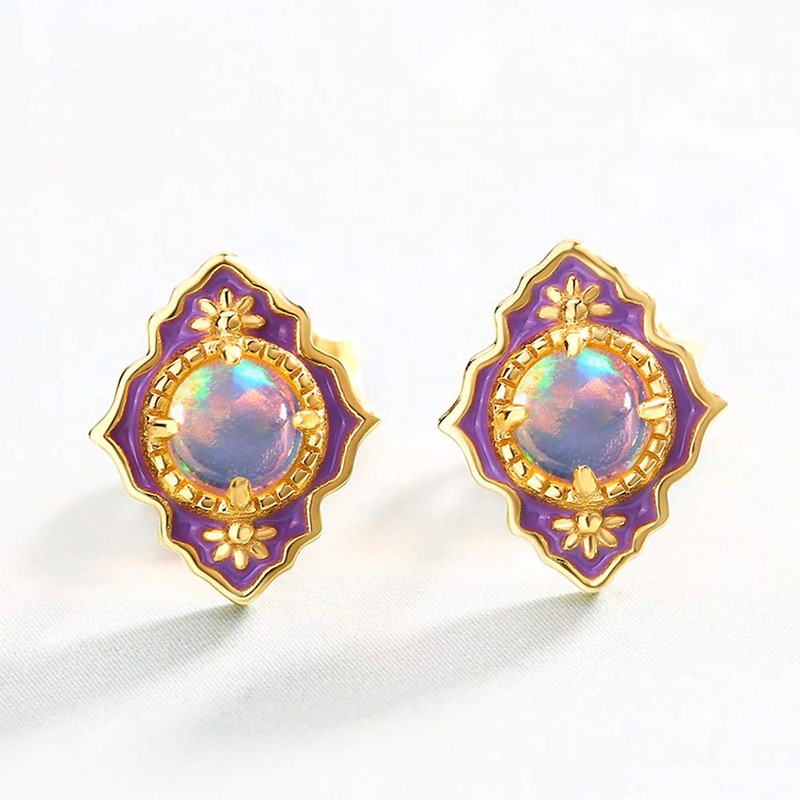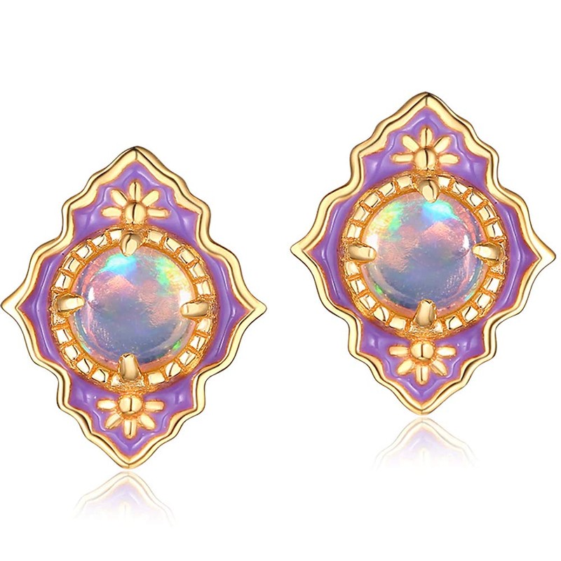 Beautiful stud earrings by Nobel Schmuck with genuine opals from Ethiopia in AAA quality, 18 carat gold plating and beautiful enamel inlays. Finely hand-crafted, the mysterious opal and the beautiful purple inlay form a pretty contrast. The earrings have a very romantic shape in vintage style. Ethiopian Opal is a special stone due to its brilliant light reflections in all colours of the rainbow.