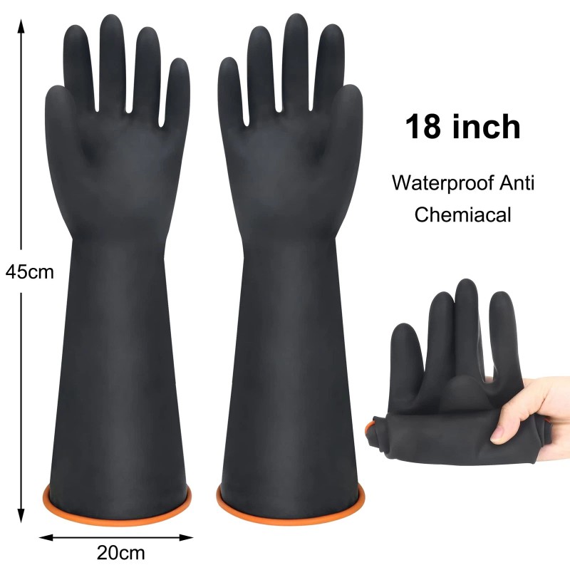 【Long Black Rubber Gloves】-- Our rubber gloves has only one oversized model, which is 18in/45cm in length and 1.1mm in thickness. Extended cuffs provide effective barrier protection for wrist and forearm from splashes, abrasives and dangerous chemicals. It is suitable for various hand types. And good feeling not lined for lightness and comfort heat resistance.