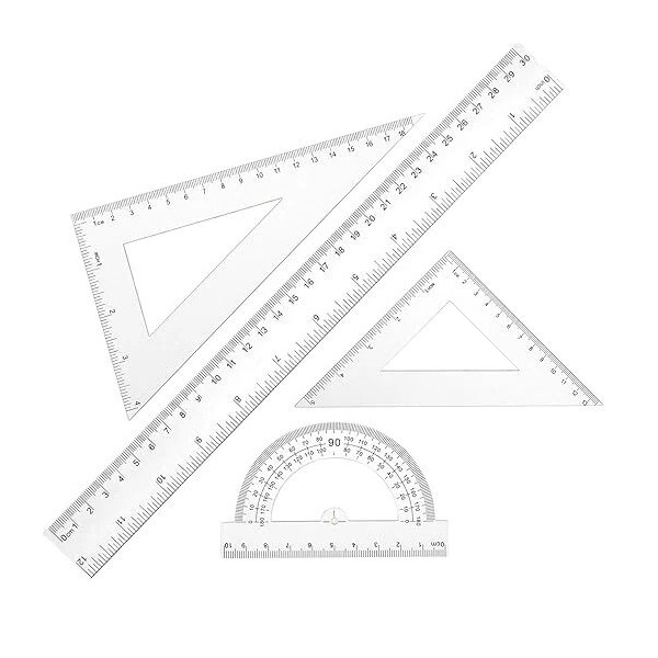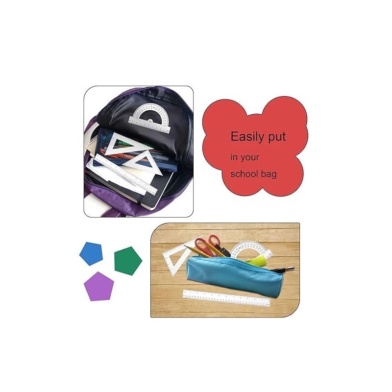About this item Complete Set: This package includes 4 pieces of geometry tools, featuring a straight ruler, 2 triangle rulers (30/60 and 45/90 degrees), and a protractor, providing a complete set for basic geometry tasks. Double Scale Ruler: Both the straight ruler and triangle rulers feature inch and metric scales for versatility. The protractor measures 0-180 degrees on both sides with 1-degree accuracy. Quality Material: Made from durable and sturdy plastic with high elasticity, these tools resist breaking and cracking. The edges are smooth for safe and practical use, ideal for designers, architects, engineers, students, and more. Easy to Read: The transparent design allows clear visibility of underlying patterns or text, aiding in precise tracing and drawing of lines, angles, and curves. Wide Applications: Suitable for math education, classroom instruction, office, home, and crafting activities. A practical set for students, teachers, designers, and anyone needing precise measuring tools. Product dimensions: 12.8 x 6.81 x 0.12 inches; 1.55 ounces.