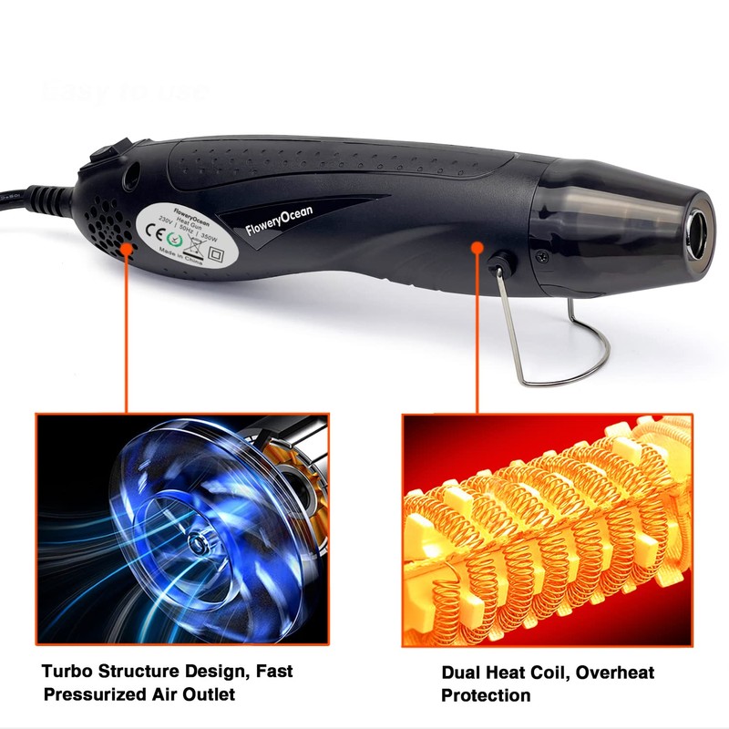 - 【Ergonomic & Insulated】: The heat gun is made of pencil shaped handle, non-slip, light weight, the housing is made of good ABS+PC, internal stainless steel, you can easily hold it without feeling too hot when heating with the heat gun. stable folding support frame leaves this heat shrink gun fixed on the table safely and easy to use. Portable mini electric heat gun can be carried with you convenient for you work at any time.