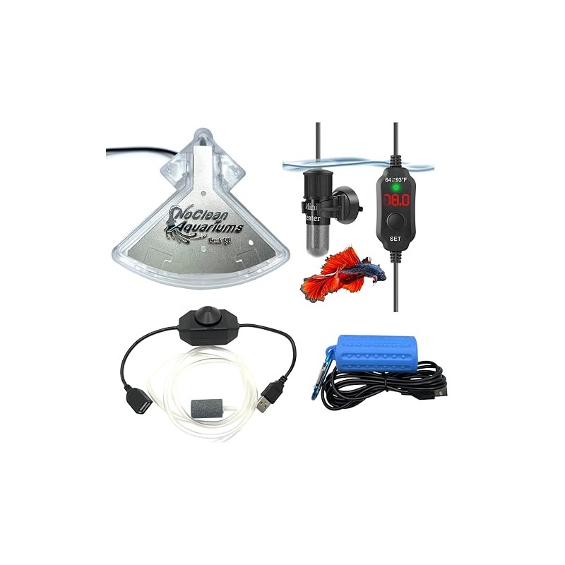 NoClean Aquariums Dazzle LED + Silent Aeration Pump Kit + 30 Watt Adjustable Mini Heater Fish Tank Accessory Kit