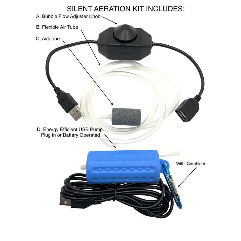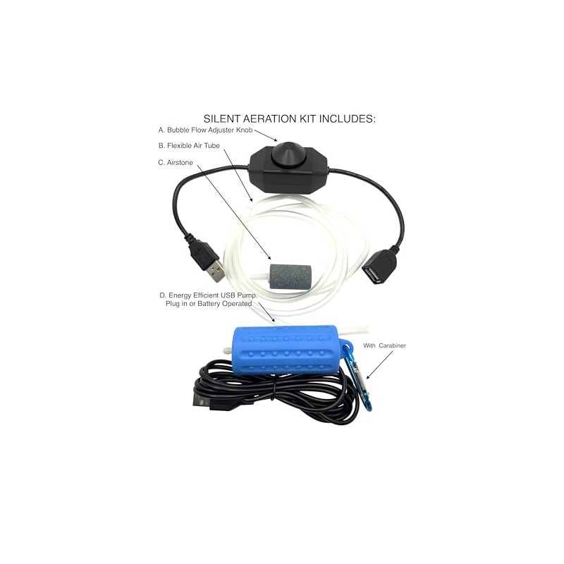 - Silent USB Aeration Pump Kit INCLUDES: -USB Powered or battery operated. ON/OFF dial switch. -Fine Tune DIMMER Throttle -Flexible Airline Tubing -Airstone AMAZON ASIN: B0BNGQ6VD8