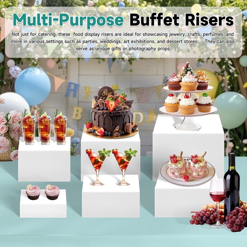 - Enhance Buffet Displays: Add elegance to your dessert presentations with these buffet food risers, elevating the visual impact of your food spread.The foldable design saves storage space, while the sturdy construction of the white acrylic boxes ensures secure placement for plates and glassware.