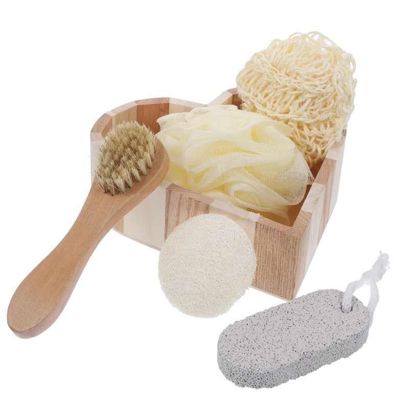 1 x Sisal Ball 1 x Loofah Slice 1 x Small Brush 1 x Foot File Stone 1 x Bath Ball 1 x Heart Shape Box