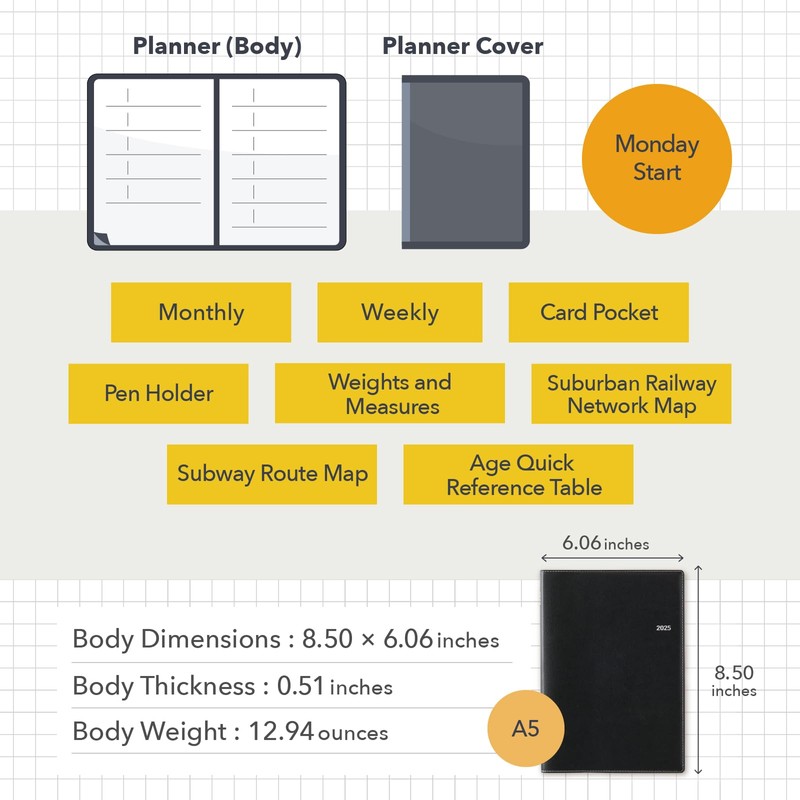 - Product Details: Size: 8.50in x 6.06in x 0.51in / Pages: 240 / Start Day: Monday / Layout: Monthly + Weekly / Paper Color: Cream